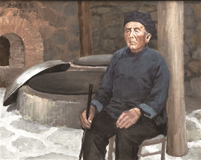 在刻画山江老人这一形象时,正赶上雨天,韩玉臣便让模特站在屋檐下,自己则把画架支在农户家里。尽管光线较暗,但这丝毫不影响韩玉臣的热情,他用细腻的笔触和微妙的色彩变化,表现了这位70多岁老人睿智的眼神,和善的微笑,执着的性格;用率意粗犷的色块,表现老人黑布包头,无领青蓝长衫的民族服饰,成了这次写生之行的经典之作。