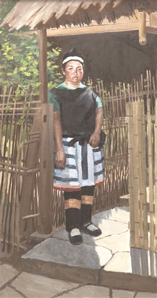 第二幅《瑶舍前的罗大妹》,是韩玉臣转山寨时觅到的极具民族特色的场景。茅草搭的门楼,竹子编的院门,竹竿围起来的菜园,原木色的板房,在一缕阳光的照耀下,乡情浓郁,充满生机。为了表现瑶族妇女的黑色白带头饰,蓝底彩色百褶裙,韩玉臣让壮硕的罗大妹悠闲地侧靠在门柱上。这幅用了三个下午完成的150×80cm的作品,人物形象典型,光感对比强烈,堪为绝美的瑶寨风情画。