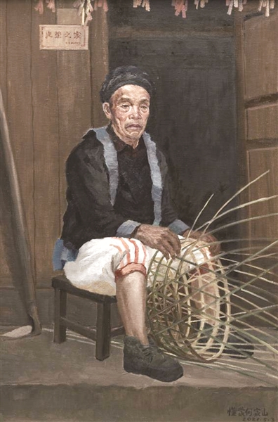 第一幅《退伍老兵何家山》的主人公是韩玉臣一进村发现的,当时这位老人正在家门口编竹篓。经过交谈,了解到老人75岁,当过三年兵,除种地外,靠编织竹制品补贴家用。老人饱经风霜的脸庞,勤劳灵巧的双手,令韩玉臣感动。于是,他让老人原地不动,继续编竹篓,自己站在那用画笔用颜色为老人塑像。为体现瑶族民俗特点,他将老人黑色的头帽,肥大宽松的白裤,门头上的吉祥物全部植入画面。