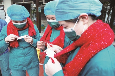 | 郑州慈善总会“爱心手工”项目执行团队为核酸检测医护人员送红围巾 |