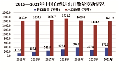 | 2015—2021年中国白酒进出口数量变动情况 (数据来源:中国海关) |