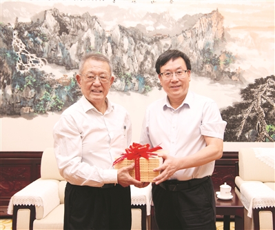 | 中国石化出版社有限公司党委委员、副总经理黄志华向顾心怿院士赠送《顾心怿传》 |