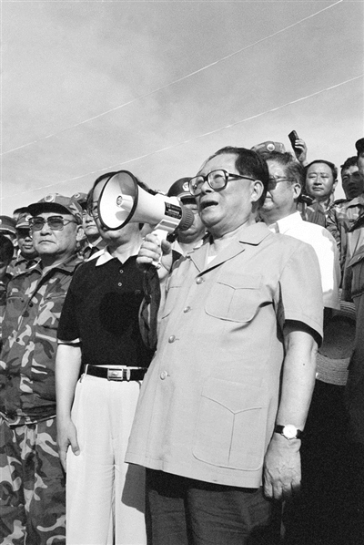 | 1998年8月13日至14日,江泽民同志亲赴湖北长江抗洪抢险第一线,看望、慰问、鼓励奋战在抗洪抢险第一线的广大军民,指导抗洪抢险斗争。这是8月13日江泽民同志在洪湖市乌林镇中沙角险段大堤上,向正在抗洪抢险的军民发表讲话。 新华社发 |