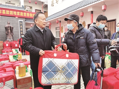| 郑州慈善总会会长姚待献为困难群众发放救助物资 |