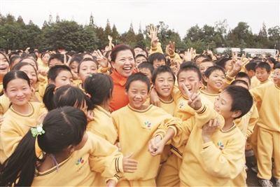 | 王琳达被授予北川中学终身荣誉校长。 图为王琳达与北川中学的学生们合影。 |