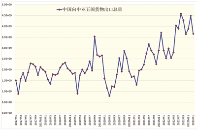 2)2017年1月至2023年1月中国向中亚五国货物出口总和折线图