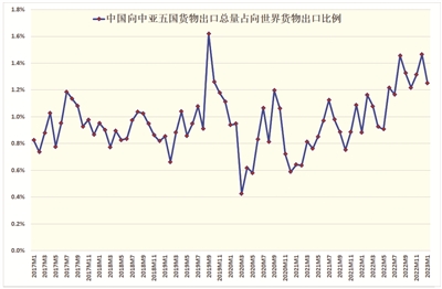 3)2017年1月至2023年1月中国向中亚五国货物出口总和占中国总出口的比例