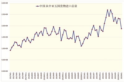 2)2017年1月至2023年1月中国从中亚五国货物进口总和折线图