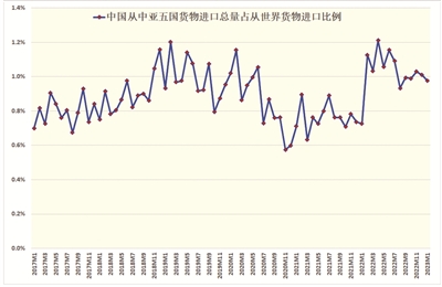 3)2017年1月至2023年1月中国从中亚五国货物进口总和占中国总进口的比例