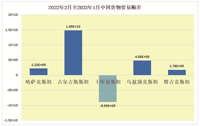 2)2022年2月至2023年1月中国与中亚五国各自货物贸易顺差