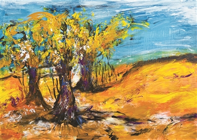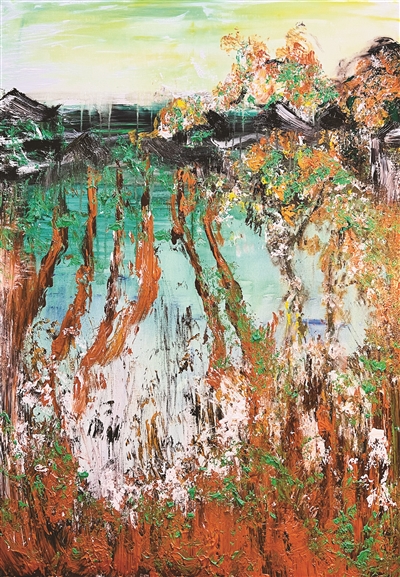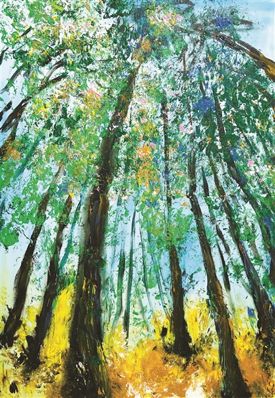吴冠中老先生曾说,中国画不能“近亲结婚”。因为我们的视野狭窄。艺术是相通的,不分东方和西方。因此,刘家男不断吸收东西方精华,并运用于作品之中。她的作品既能呈现出西方作品的色彩美感,同时又兼具中国泼墨的画面呈现。无论是胡杨林系列,还是天端系列、鲸落系列以及自然系列,其作品的整体色彩都是非常大胆的,给人以强烈的视觉冲击。刘家男认为,这是一个艺术家应有的标志性符号。
