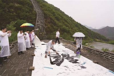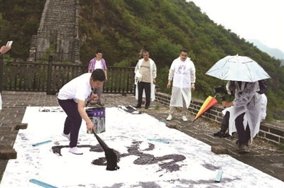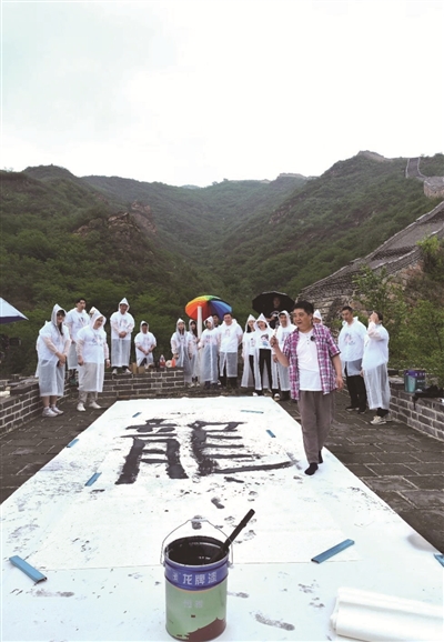 6月19日,龙生甘霖,细雨霏霏,八达岭长城如一条巨龙横亘苍山翠绿间。北新建材“翰墨飘香迎端午”的品牌文化活动在这里拉开帷幕。数十位书法爱好者和书法家一起,共同在百米长卷上书写“龙”字,欢庆端午,传播中国文化和中国品牌。