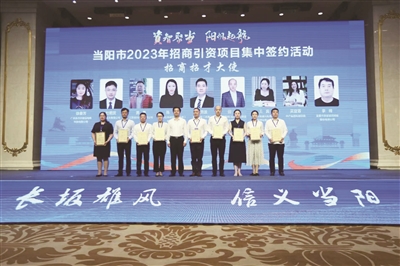 活动现场,集中签约项目24个,并聘任江苏谷川商务有限公司黄勇、三峡大学材料与化工学院党委书记杨学林、天津中科先进技术研究院有限公司总经理吴正斌、深圳中商产业研究院有限公司董事长杨云、湖北冠毓新材料科技有限公司董事长张韬等21名“招商招才大使”为当阳出谋划策、引荐投资。