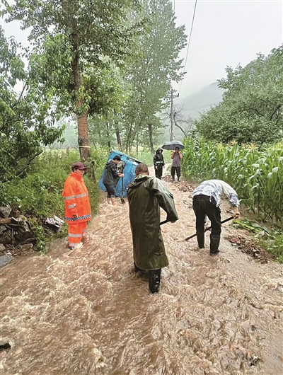 | 孙家泉村党员群众冒雨疏通排水渠 |