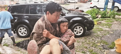 | 东刘家庄村党支部书记张建民紧紧抱着老人冒雨前行 |