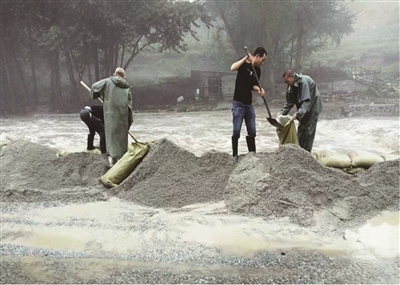 | 银山口村党员干部群众用沙袋紧急护堤 |