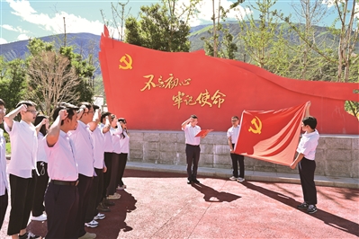 | 2023年6月30日,拉哇项目部开展“七一”主题党日系列活动,重温入党誓词。 牛卫东/摄 |