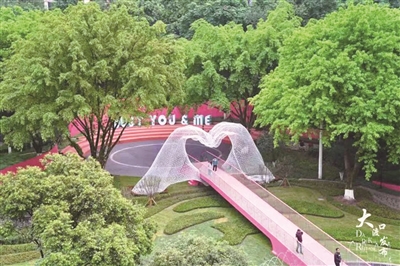 爱情公园位于八桥镇丽景社区中交丽景旁,占地面积3.6公顷。2023年3月,重庆市大渡口区城市管理局对爱情公园进行了品质提升。记者在现场看到,爱情公园以浪漫梦幻的玫瑰粉为主色调,极富风情的粉红山谷是拍照打卡的最佳背景。白天,这里绿树红花相映成趣;夜里,多彩灯光让公园变得流光溢彩、如梦似幻。不仅如此,品质提升后的爱情公园还融入了一片功能性场地,增设健身器材和儿童游戏区,从传统的公园绿地转变为辐射全龄的主题性公园。