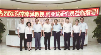 | 深圳调研(左四为深圳交易集团董事长陈戈,左六为深圳交易集团总裁刘庆云,左五为常修泽,左三为何亚斌) |