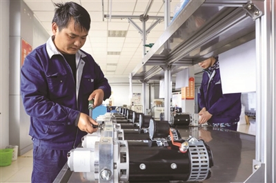 | 在力威汽车油泵有限公司,工人们正开足马力加紧研发生产新能源汽车动力单元配套产品。 |