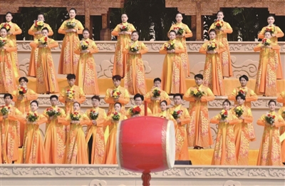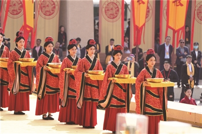 大典共有九项仪程,分别是:盛世礼炮、敬献花篮、净手上香、共拜始祖、恭读拜文、高唱颂歌、乐舞敬拜、祈福中华、天地人和。