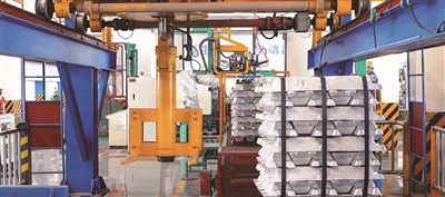 | 霍煤鸿骏铝电公司自动化机械手完成铝锭最终打捆 |