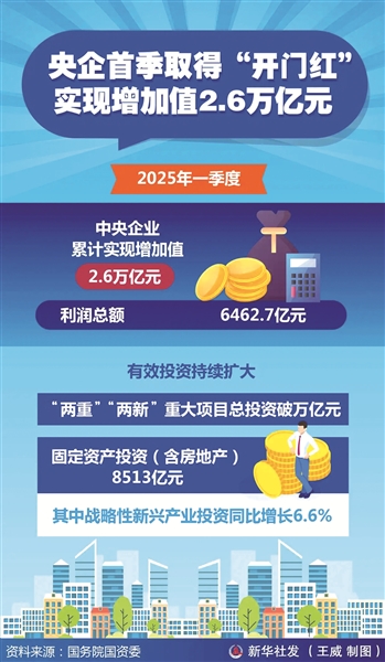 今年一季度,中央企业累计实现增加值2.6万亿元、利润总额6462.7亿元,有效投资持续扩大,“两重”“两新”重大项目总投资破万亿元,固定资产投资(含房地产)8513亿元,其中战略性新兴产业投资同比增长6.6%。