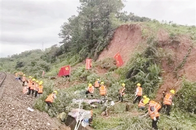 | 中国中铁救援抢险人员开展道路清障工作。 |