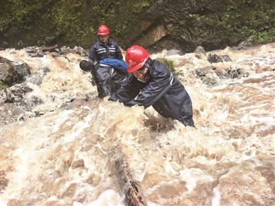 | 南方电网云南电网公司抢修人员在徒步进入独龙江乡途中遇到湍急浑浊的河流,他们手搭一根木头,相互协作,艰难蹚水过河,无畏风雨与激流,全力守护电力供应。 |
