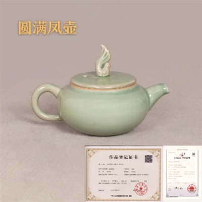 会谈中,李浩中向格林主席展示了平顶山汝瓷的独特工艺与文化底蕴。他特别阐释了汝瓷“天青色等烟雨”的烧制哲学,强调其“雨过天青云破处”的自然美学与东方智慧。在众多展示珍品中,一件名为“圆满凤壶”的汝瓷作品尤为引人注目。该壶以宋代官窑器型为蓝本,采用“天圆地方”的设计构造,釉色呈现出汝瓷特有的层次变化。壶盖顶部有一只展翅欲飞的凤凰雕塑,其昂首振翅的姿态既暗合飞虎队翱翔蓝天的英姿,又象征着中美友谊的新生。这件作品连同李浩中亲手制作的“渡海观音”和“福宝”两件珍品,被格林夫妇郑重收藏。
