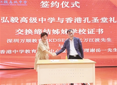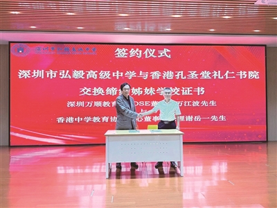 为积极响应建设粤港澳大湾区和深圳先行示范区的重大国家战略,促进深港两地教育交流和合作,提升中国教育服务能力和国际影响力,8月6日下午,深圳市弘毅高级中学举行签约仪式,与香港孔圣堂礼仁书院缔结姊妹校,并正式启动弘毅万顺香港DSE项目(以下简称“香港DSE项目”)。众多深港两地教育界专家、学者及嘉宾莅临现场,共同见证了这一重要时刻。