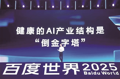 大会上,李彦宏再次强调AI应用创新的价值。他表示,AI产业结构正从不健康的“正金字塔”转变为“倒金字塔”。在“倒金字塔”中,模型产生的价值相比芯片提升10倍,AI 应用能创造100倍于芯片的价值,从而形成健康的AI产业结构。