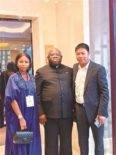 | 陈国锋(右)赴塞拉利昂考察时,与塞拉利昂国家投资委员会主席法蒂玛·马哈瓦·桑迪(左)、塞拉利昂驻华大使阿布·巴卡尔·卡里姆(中)合影 |